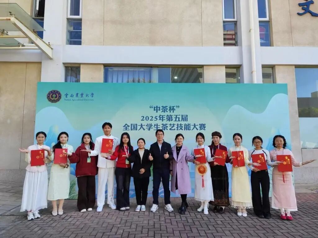 12月10日-12日,由高等学校国家级实验教学示范中心联席会主办,云南农业大学等单位联合承办的“中茶杯”2025年第五届全国大学生茶艺技能大赛全国总决赛在昆明拉开帷幕。我校茶学系在指导老师的精心指导下,团结协作,勇于创新,凭借扎实的专业功底与出色的临场发挥,荣获大赛二等奖4项,三等奖4项,展现了学校在茶学教育与应用型人才培养方面的显著成效。